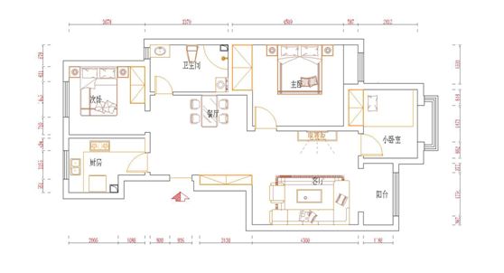 原始图分析:本方户型为三室两厅半南北通透户型,属于明客厅明阳台,明厨明卫,主卧室还有一个大飘窗,便于储存一些零碎的东西,小卧室有一个飘窗,可以做一个飘窗柜,平时休闲看书用。厨房属于细长型结构,卫生间空间比较大能够合理摆放洁具。