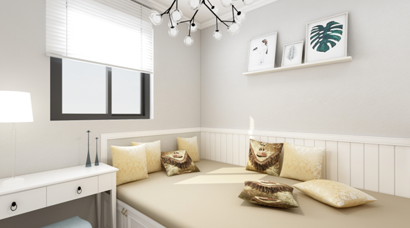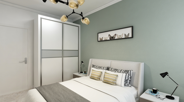 睡床是沿着窗户摆设,两边预留阿足够的走动空间,床头背景粉刷灰绿色墙漆,突出床头背景,与地面地砖颜色相近,看起来甚是和谐。床品采用浅灰色软包形式,增加卧室的舒适感,配上深灰色的床品床头两边金属材质的台灯凸显了整个空间的大气感,床旁边有一个大大衣柜增加了整个屋子的储物空间,卧室顶面采用石膏线,从视觉不会显着压顶.现代住所的开展,小家庭的组成,大家心理上的需求,期望卧室具有私密性、蔽光 性,配套洗浴,静谧舒服,与住所内其他房间分隔开来。我规划的卧室除了主卧加了个内卫外,再者除了摆放双人床外,留有必定的面积摆放卧室家私,如衣柜,电视柜,床头柜,还留有必定空间能够休闲活动