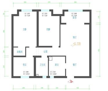 2、 此户型没有阳台,后期应该从客厅位置规划出一个阳台