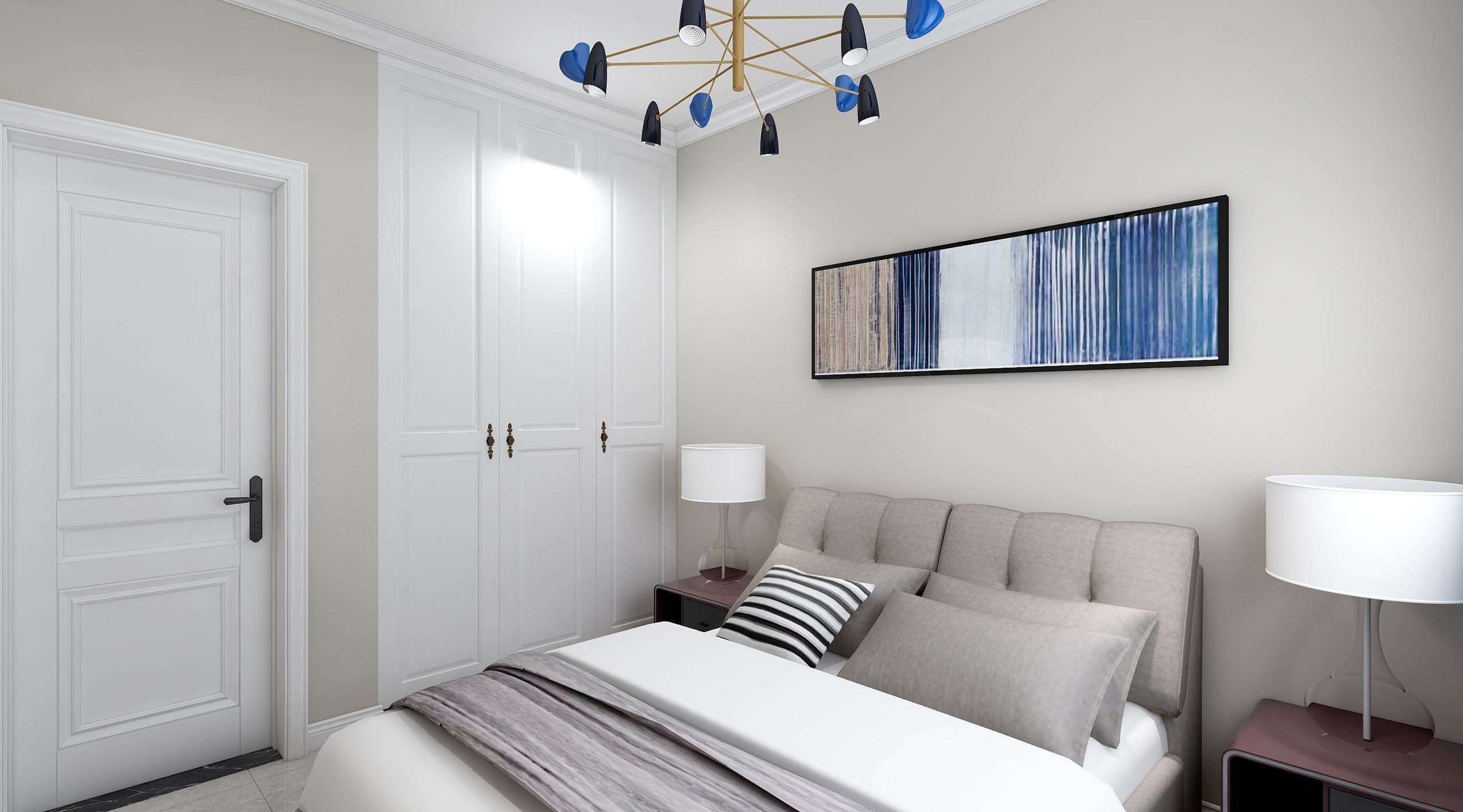 睡床是沿着窗户摆设,两边预留阿足够的走动空间,墙面粉刷浅灰色的墙漆与地面地砖颜色相近,看起来甚是和谐。床品采用浅灰色软包形式,增加卧室的舒适感,配上深灰色的床品床头两边金属材质的台灯凸显了整个空间的大气感,床旁边有一个大大通顶的衣柜增加了整个屋子的储物空间,卧室一进门的位置顶面做了个平面吊顶,减弱了卧室的刀把形状 现代住所的开展,小家庭的组成,大家心理上的需求,期望卧室具有私密性、蔽光 性,配套洗浴,静谧舒服,与住所内其他房间分隔开来。我规划的卧室除了主卧加了个内卫外,再者除了摆放双人床外,留有必定的面积摆放卧室家私,如衣柜,电视柜,床头柜,还留有必定空间能够休闲活动