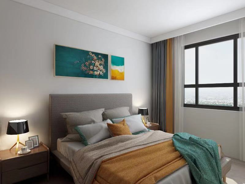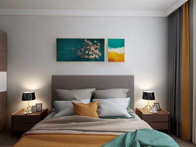 卧室以舒适为主,颜色不宜太暗,要避免使用大面积深色以防止闷重的感觉。所以在卧室的配色上用浅色调来进行调和。床头上配简单装饰画来点缀