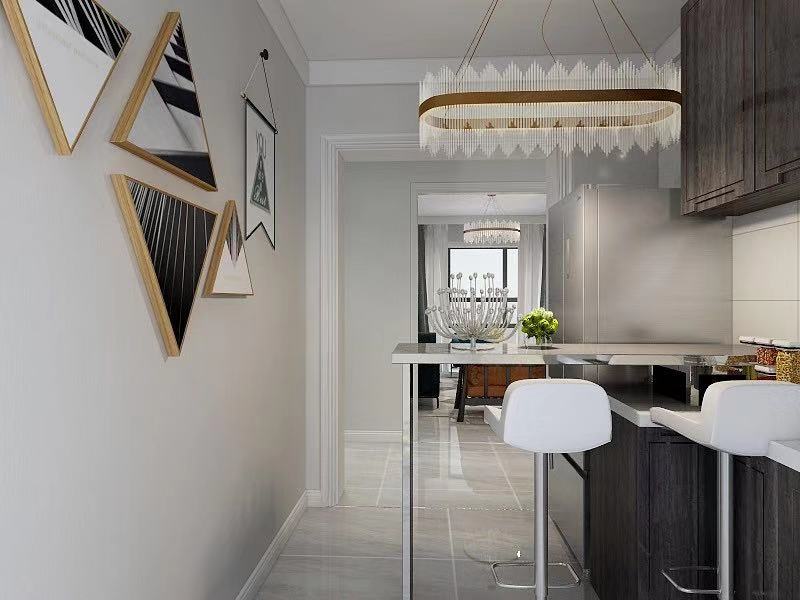1. 厨房面积不算大,但是客户想把冰箱放餐厅,经过模型布置方案设计决定把冰箱放到餐厅,做个吧台,这样宽敞明亮,客厅空间大,隔出一个生活阳台所以客厅布局比较简单,除了生活中必备的一些东西,没有多余的布置。从而使得客厅整体空间更简洁大气明亮。