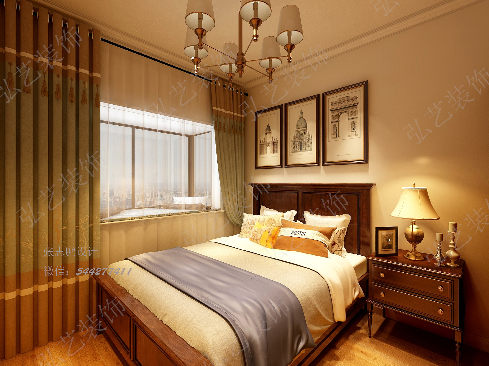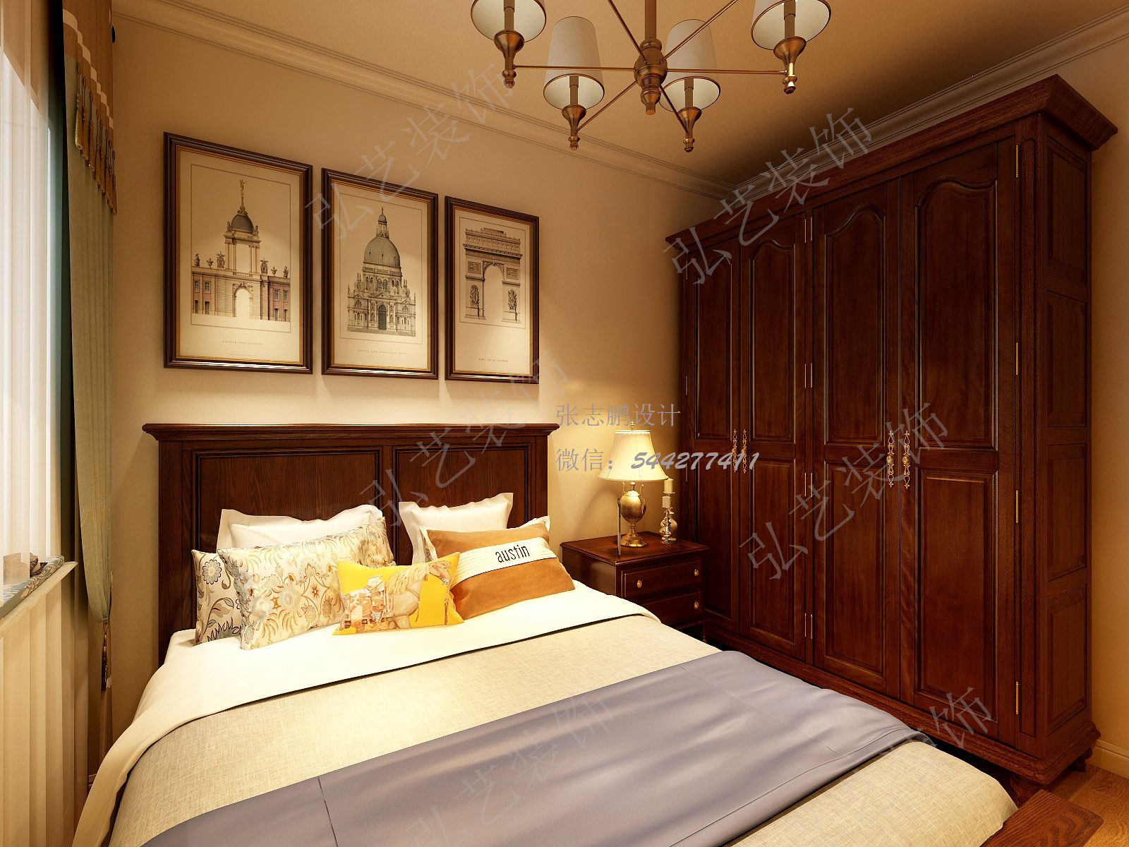主卧的整体色彩仍以主人喜爱的色调为主,配以深色家具,烘托出舒适、静谧、放松的心境。米色棉麻材质被子,最大可能应用与自然贴近的颜色与元素,创造舒适自在的生活方式。透视感,空间之间可以互相共享,增加空间层次。留有充裕的储物空间,可以随心安置私人物品。加上点小装饰画的点缀,显得整体柔美,这样回到家以后就可以身心放松!