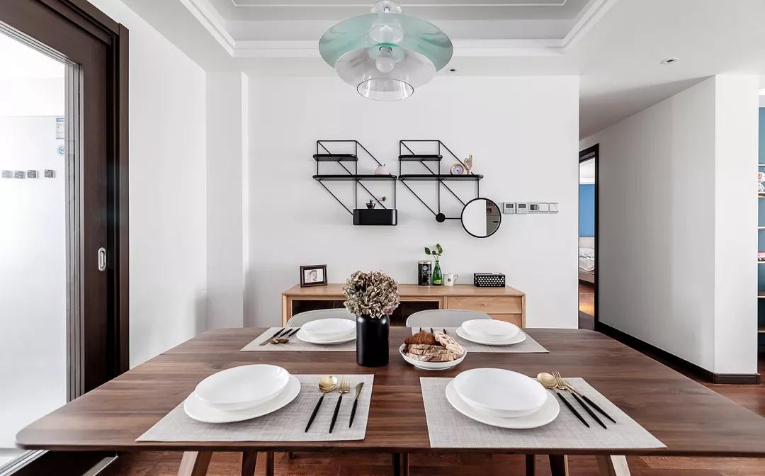 餐厅,胡桃木餐桌椅充满质感,蓝白搭配的伞状吊灯轻盈而别致,增添层次的同时提升空间格调。
