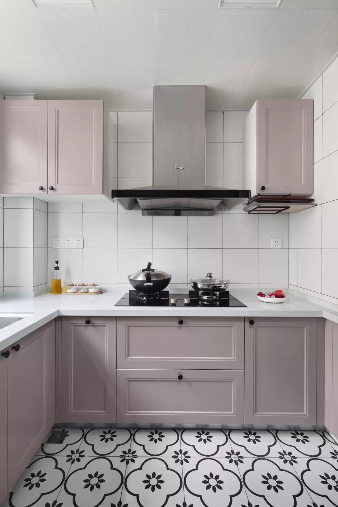 厨房特意挑选了花砖地砖,满足了女主人的少女心,搭配简洁优雅的浅灰调橱柜,营造轻松浪漫的烹饪氛围。