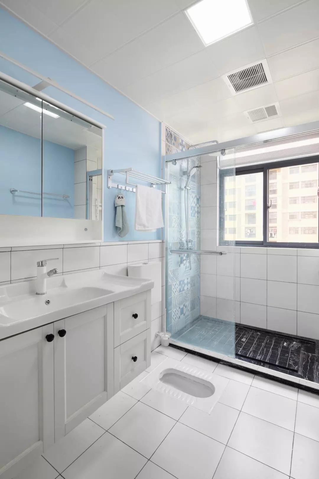 卫生间洗漱区的白色地砖延续到了腰线高处,配合天蓝色的墙面,营造格外清新的氛围。淋浴间则以墙面花砖和地面黑砖加以区分,玻璃隔断有效防止了湿气散发。