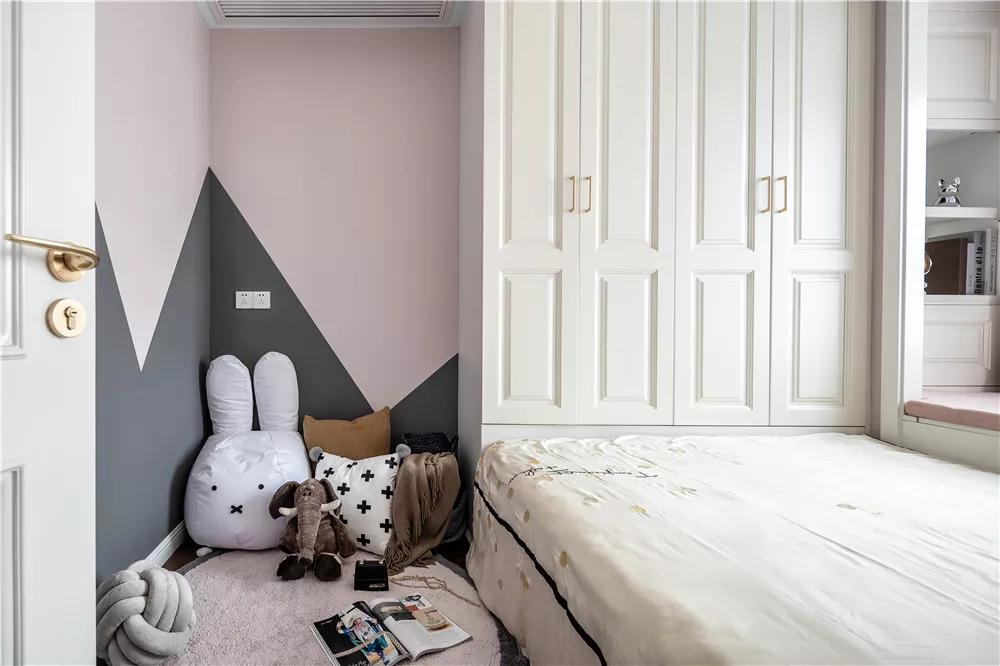 女儿房采用粉丁香色为主调,温馨而浪漫。墙面做了粉灰两色的拼色造型粉色圆形小毯子柔软而舒适,摆放可爱的玩偶以及有趣的书籍,甜美而不失精致感。