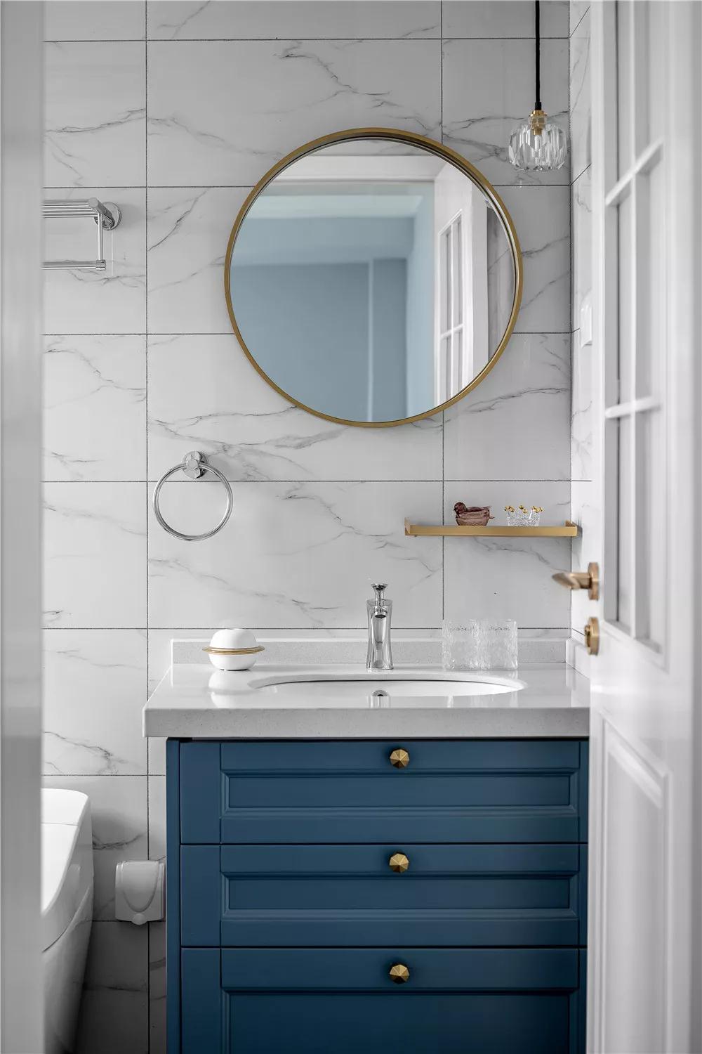 卫生间以自然清冽的大理石瓷砖为基础,金边圆镜突出精致感,星空蓝色调的经典美式斗柜,配以金色拉手彰显轻奢韵味。