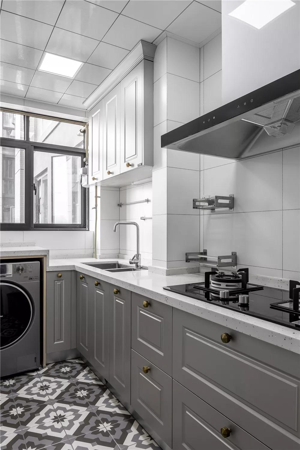 厨房整体以灰白两色为主调,地砖采用白、棕、灰三种颜色相间的花纹设计,丰富空间层次,精致而有格调。