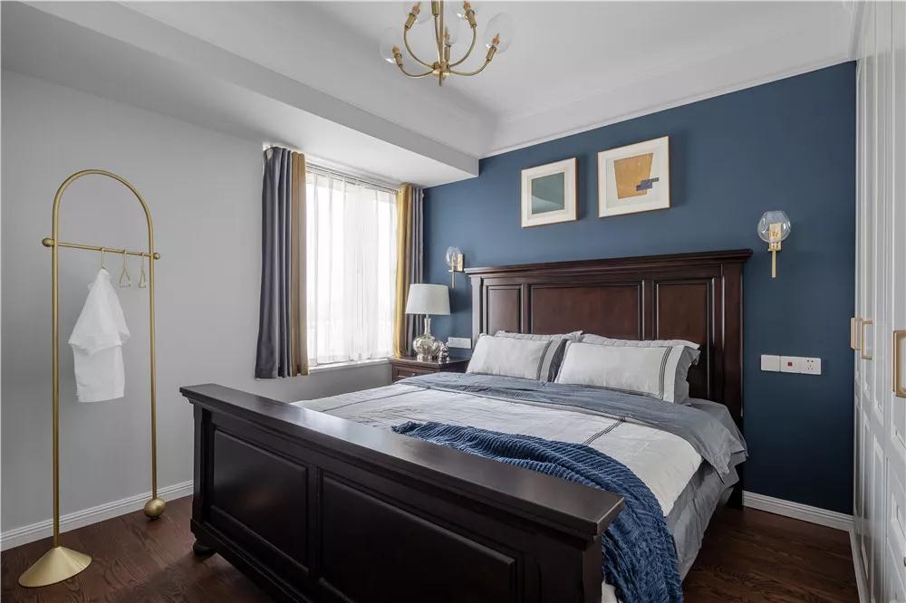 主卧墙面采用了深邃且静谧的雾霾蓝,轻奢落地转角衣帽架,便于穿戴衣物放置。