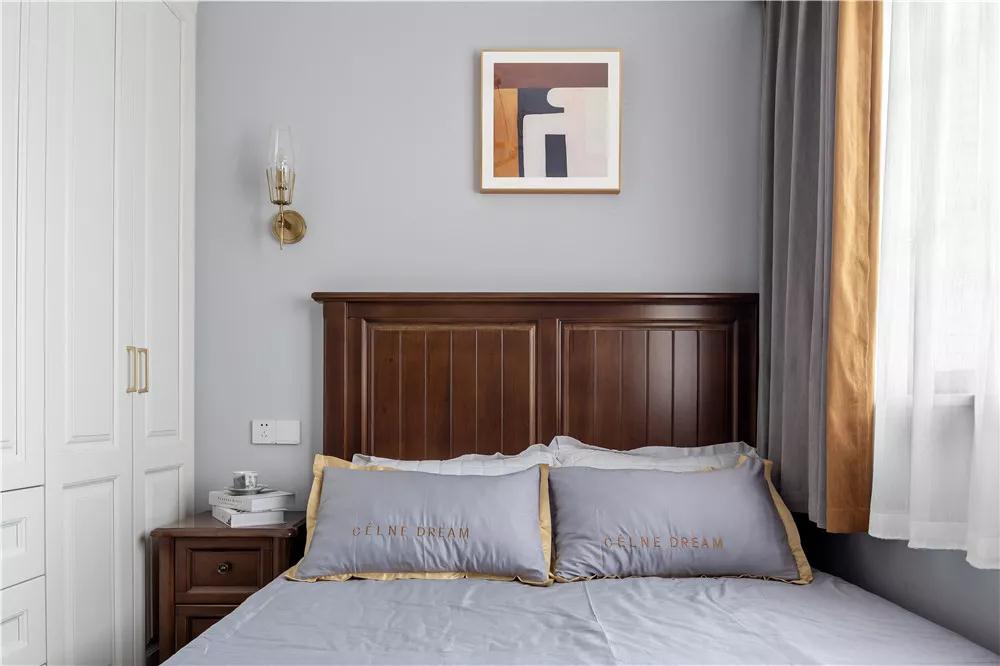 次卧以浅灰色为主调,加以橙色的细节软装,搭配背景墙的金色相框挂画点睛,简约内敛不显单调。