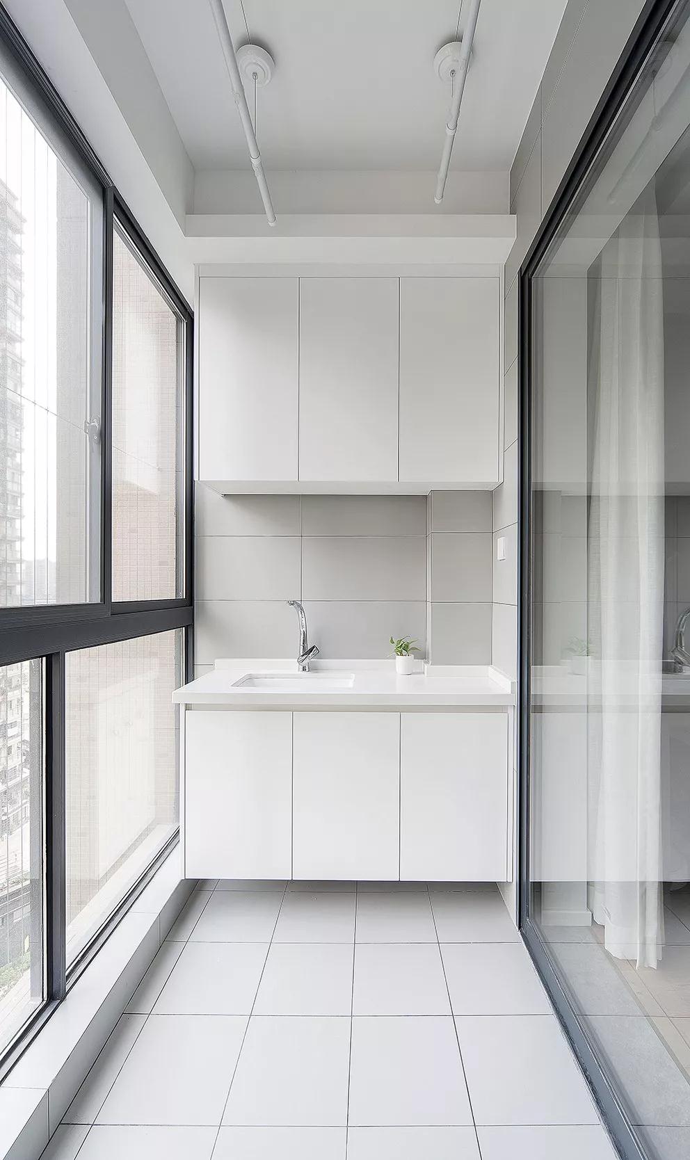 纯色的素面砖铺贴搭配白色的烤漆柜,让阳台看起来是那么的简单干净。