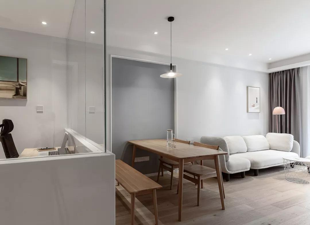 客餐厅以灰色和白色为主调,大面积的玻璃窗带来良好的采光性,整体空间干净明亮又舒适。