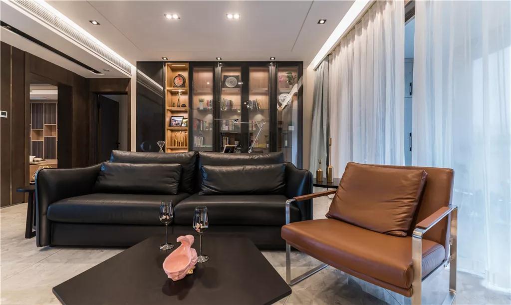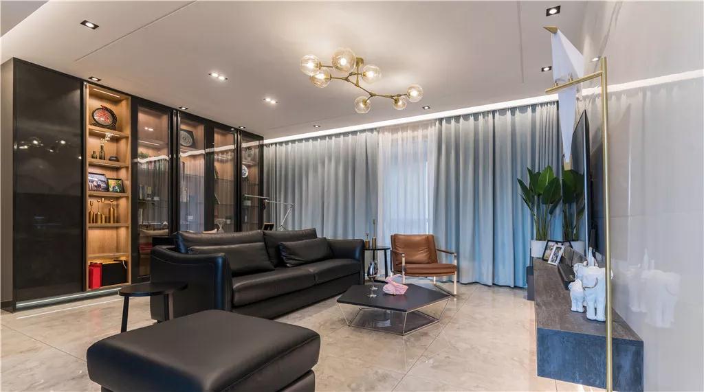 客厅与沙发后的书房打通,简洁利落的布置结合明快的黑白配色,让整个空间焕发出轻快活力的高档质感。 皮艺沙发以书房的玻璃书柜作背景,让琳琅满目的摆件展示带来高档大方的韵味。 客厅与书房共享筒灯+树枝吊灯的照明,沙发