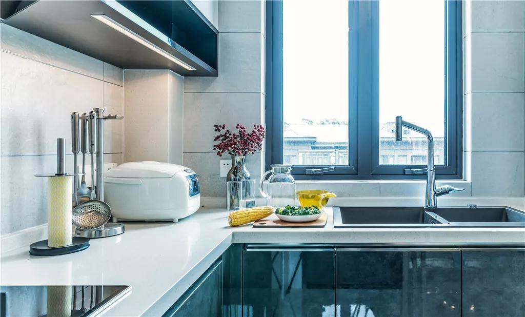 厨房采用了偏冷的色调,白色的操作台面搭配有序的厨具收纳,营造了清爽利落的烹饪格局。