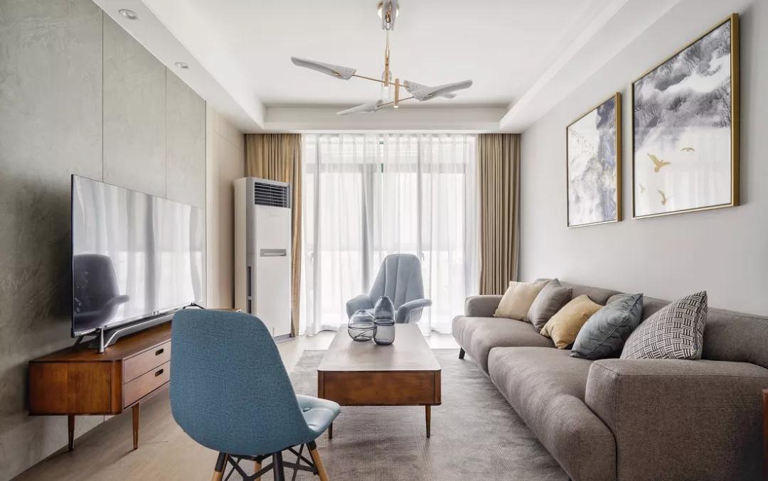 利用一深一浅的蓝色,这组相色系作为整体的配角色,打破灰色沙发带来的沉闷感。 光线透过黄色的窗帘,温暖了略冷的基调,由着木色元素贯穿全局。 堂前两幅挂画,些许水墨诗意,生活亦可处处皆诗意。 电视背景墙采用切片对称的方