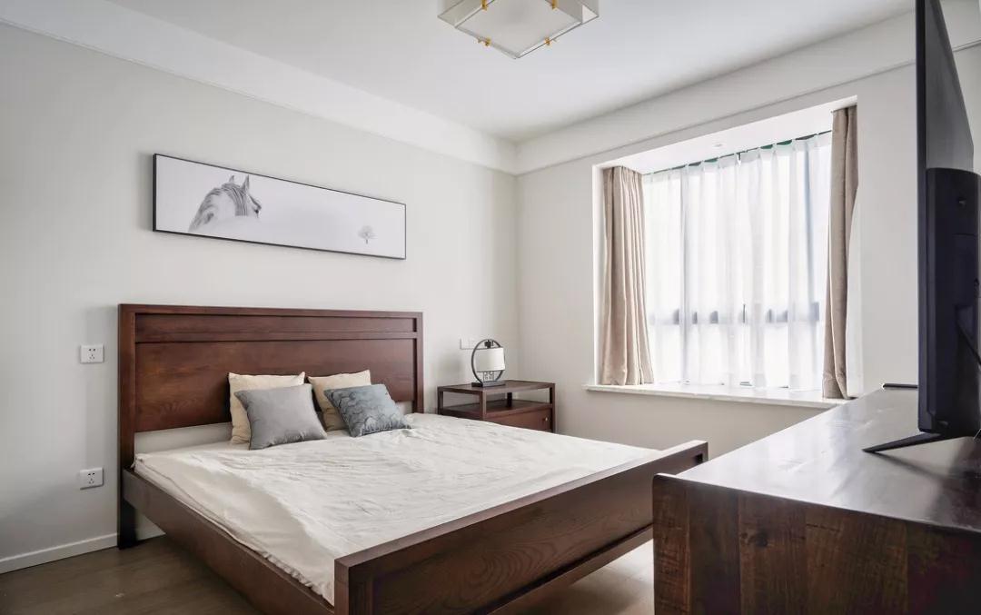 主卧空间是作为父母居住使用,没有复杂的装饰,延续外部的整体色调,柔和色彩与深木色调和,营造出舒适的休息环境。