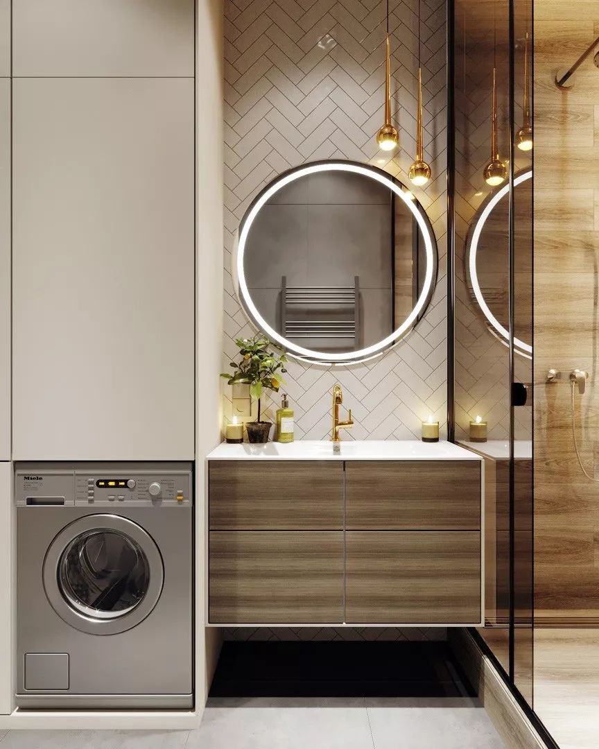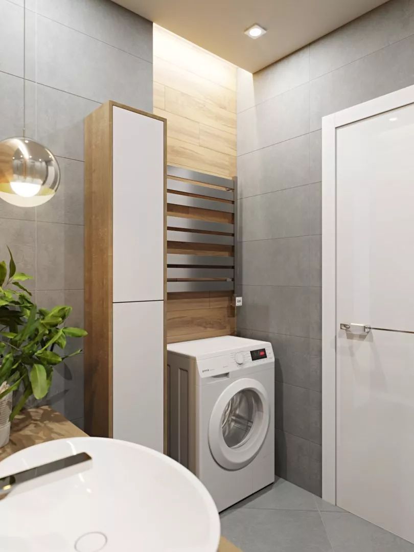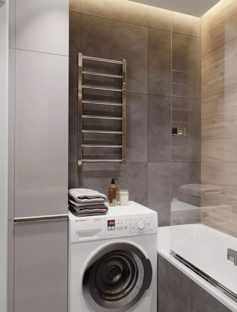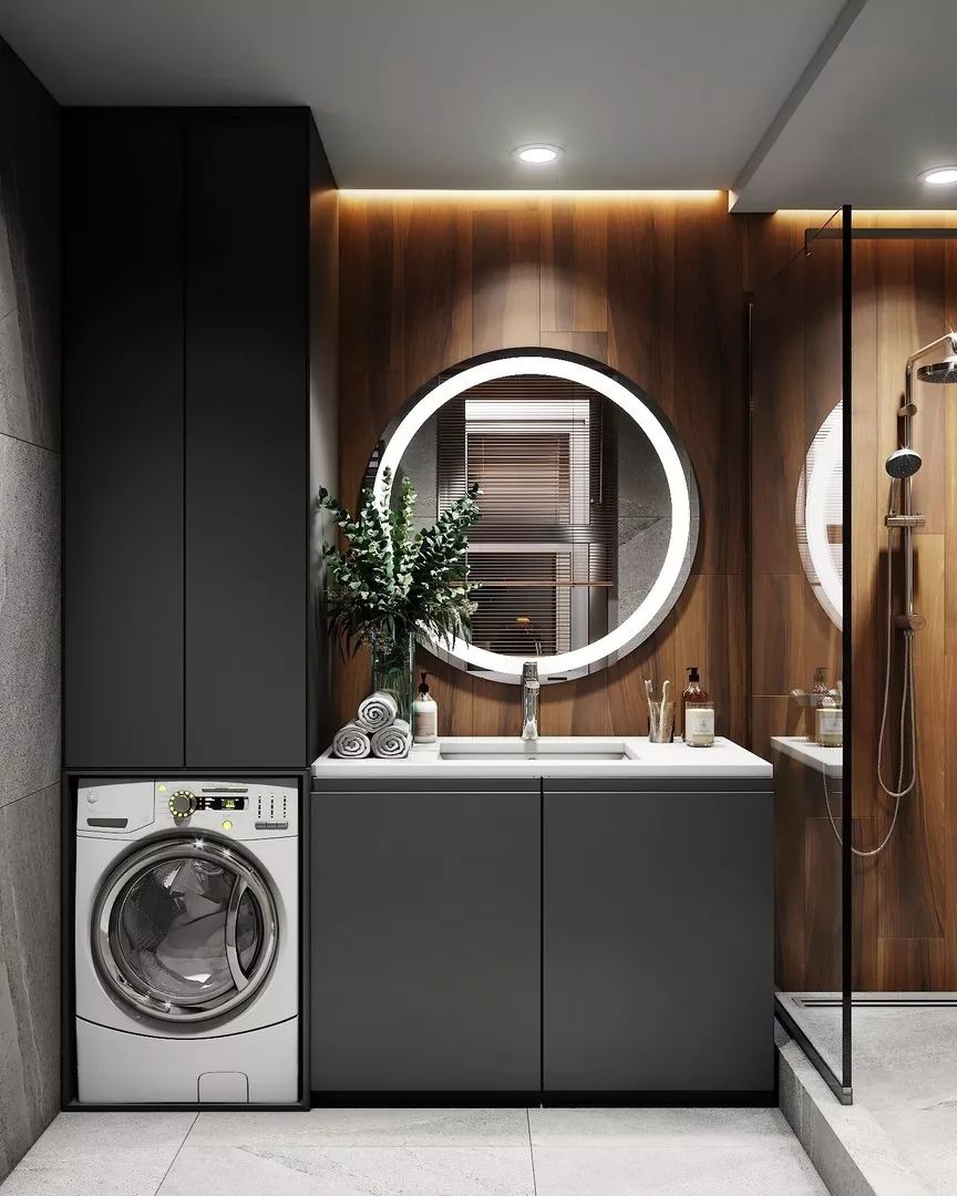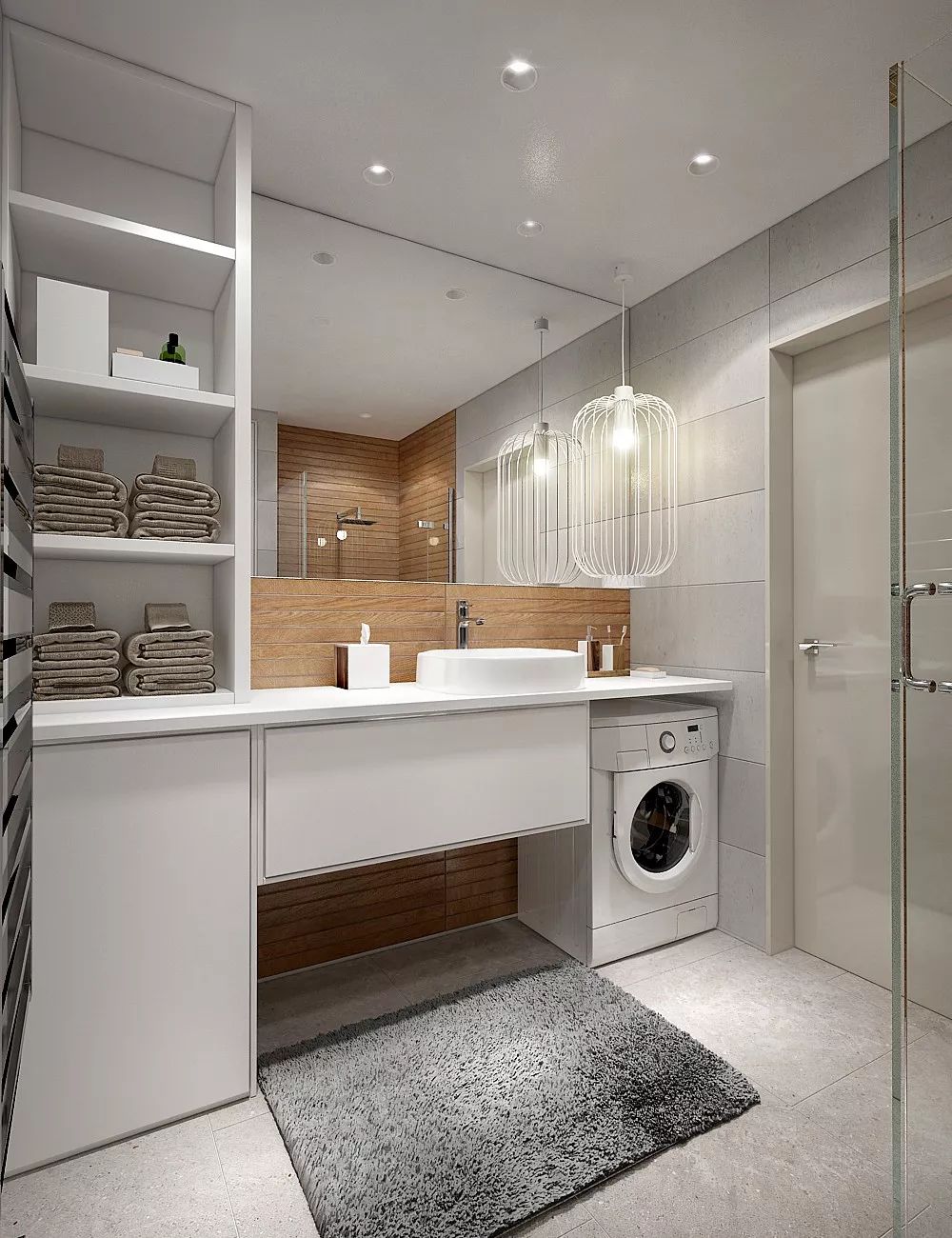 洗衣机设计在洗漱台下,这样排水非常方便,洗漱台可以按照洗衣机的尺寸先定制好,还可以顺便再做一个收纳柜。